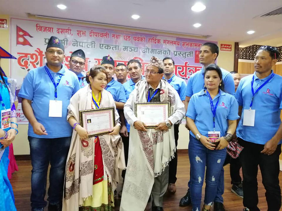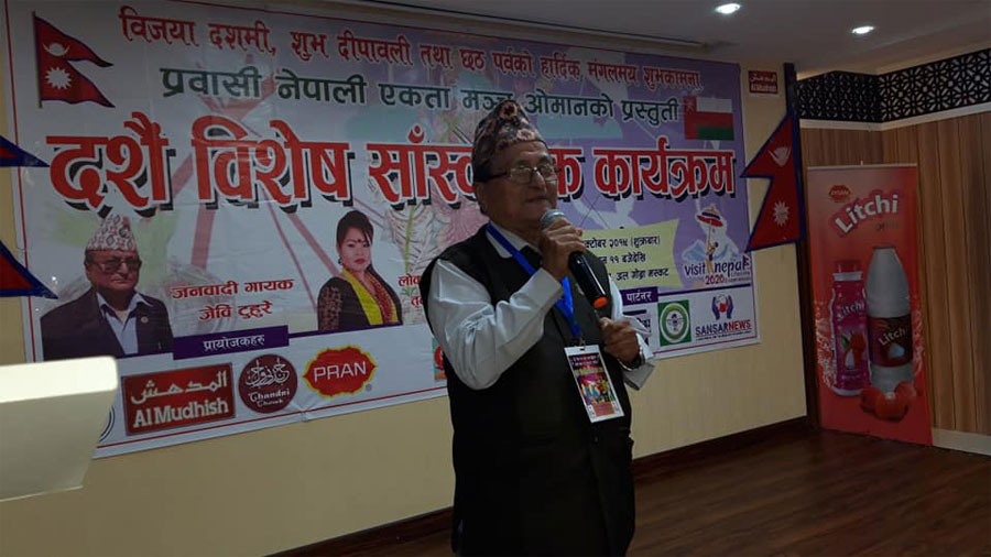 उपस्थित अतिथिहरुलाई संस्थाका सदस्य सम्झना केसी, बिबि माँया तामाङ्गले ब्याच लगाई सम्मान गरेका थिए ।ज्ञात अज्ञात सहिदहरु प्रति मौन धारण गर्दै, मैनबत्ति बालेर राष्ट्रिय गीत बजाई कार्यक्रमको उद्दघाटन गरिएको उक्त कार्यक्रममा प्रवासी नेपाली एकता मञ्च ओमनका सदस्य लिला नाथ कोइरालाको स्वागत मन्तव्य रहेको थियो ।प्रमुख अतिथी नेपाली राजदूतावास ओमनकी श्रमसहचारी कृष्ण कुमारी गौली लगायत विभिन्न संघ संस्थाहरुले दशैँ शुभकामना मन्तब्य राखेका थिए । मन्तव्यसँगै श्रमसहचारी कृष्ण कुमारी गौली संस्थाका कार्यक्रम अध्यक्ष उमेश विश्वकर्माले आशीर्वाद दिदै उपस्थित सबैलाई टीका जमरा लगाई दिएका थिए । पुर्ण विश्वकर्मा ( पहाडी) को संचालन रहेको उक्त कार्यक्रममा नेपाल जनवादी कलाकार जेवि टुहुरे, लोक गायिका तुलसी घर्ती मगरको प्रस्तुतिले सबैलाई रमाइलो बनाएको थियो ।