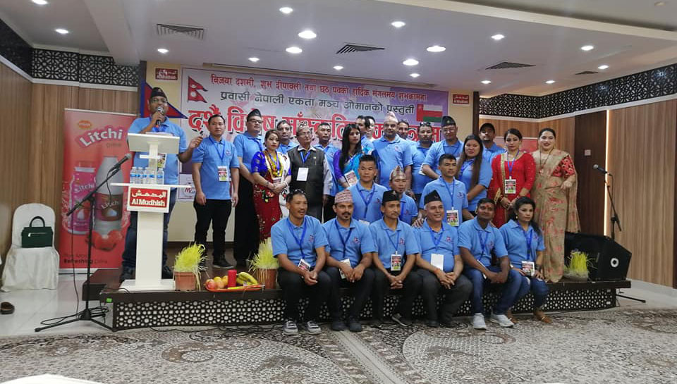 ओमानप्रवासी नेपाली एकता मञ्च ओमानद्वारा आयोजित बृहत साँस्कृतिक कार्यक्रम ओमनको गोब्रास्थित अलमाहा इन्टरनेशनल होटलको हलमा अक्टोबर ११ तारिक शुक्रबारको दिन भब्यताको साथ सम्पन्न भएको छ ।प्रवासी नेपाली एकता मञ्च ओमानको कार्यदल सदस्य उमेश विश्वकर्माको अध्यक्षतामा सम्पन्न कार्यक्रममा प्रमुख अतिथि नेपाली राजदूतावास ओमन कि श्रमसहचारी कृष्ण कुमारी गौली रहेकी थिइन् भने विशिस्ट अतिथिमा चर्चित जनवादी गायक जेबि टुहुरे रहेका थिए ।